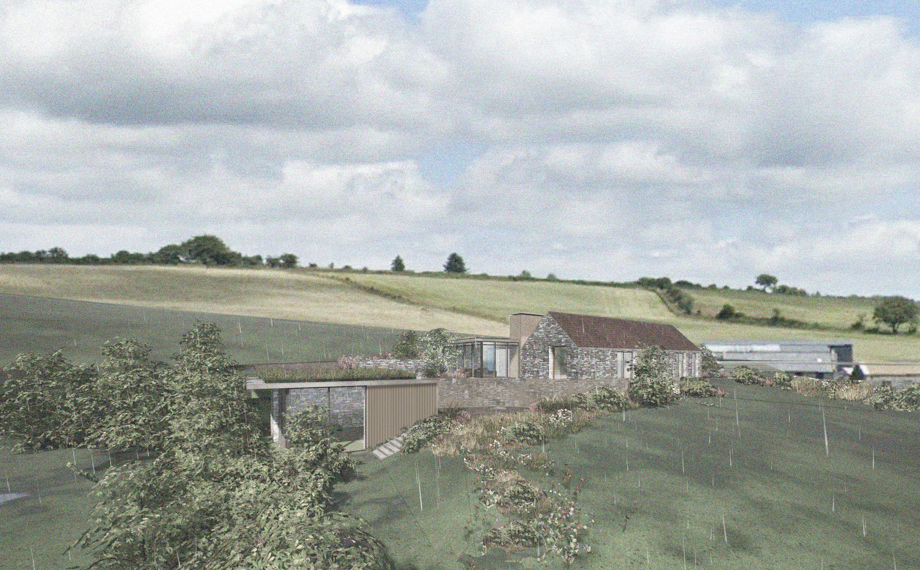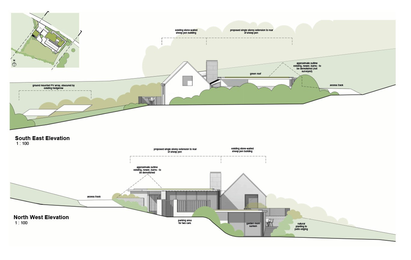 The retained structure forms the prominent elevation, preserved and minimally altered with new timber windows and doors. Behind this, a contemporary green-roofed volume is embedded into the landscape with soft planting and a reduced profile to limit its visual impact.